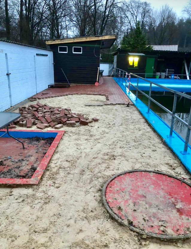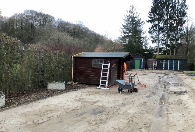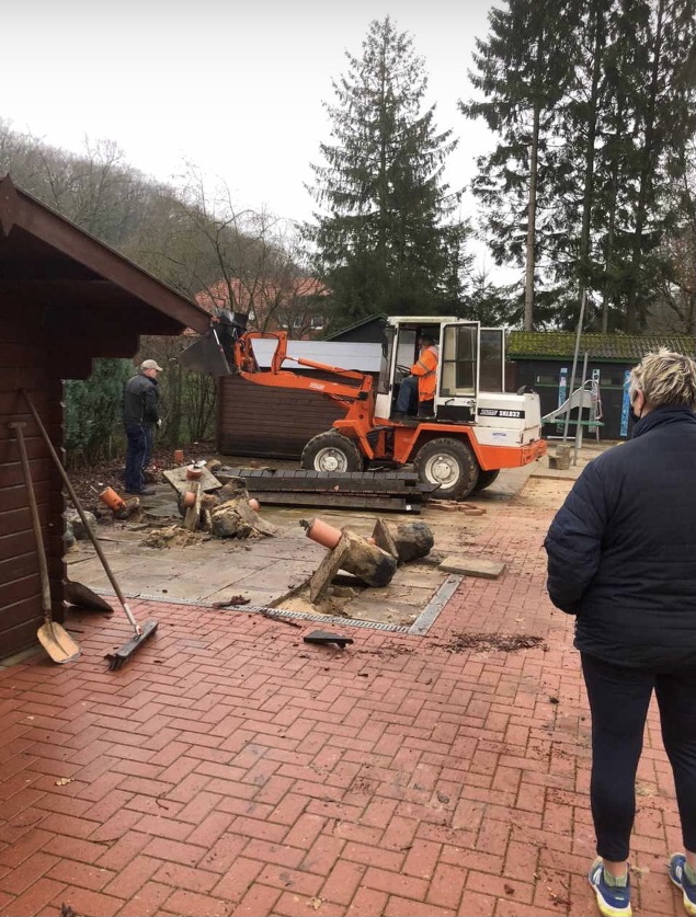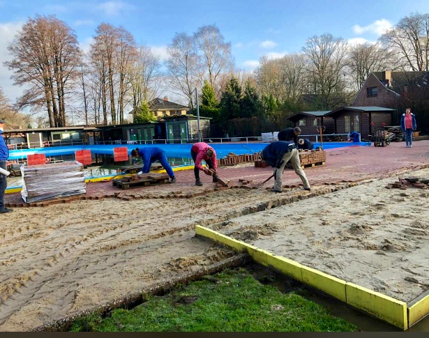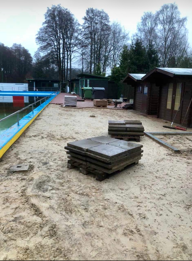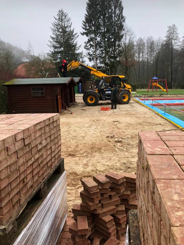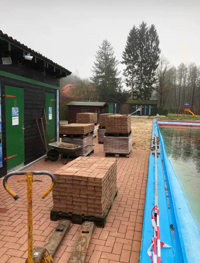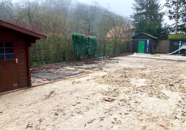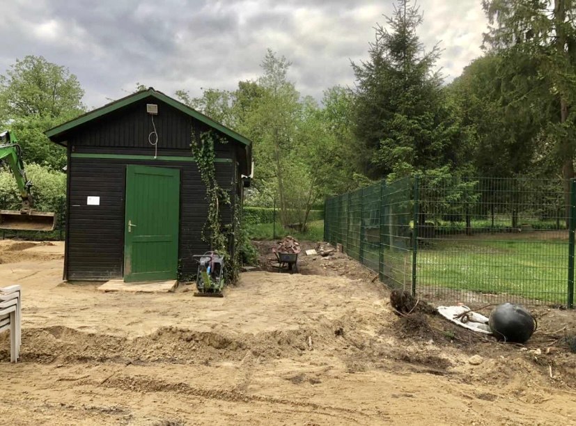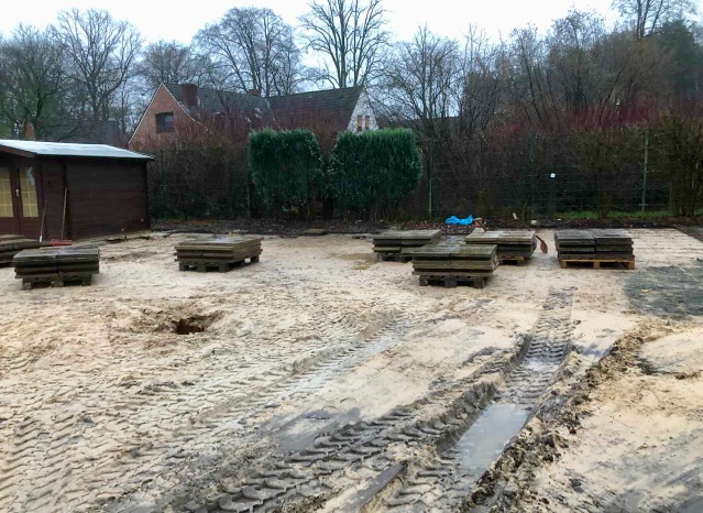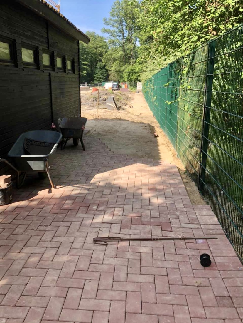 Es geht voran, die ersten Pflasterarbeiten wurden von Mitgliedern des Fördervereins geleistet. Der Aufbau nimmt auch langsam Formen an: