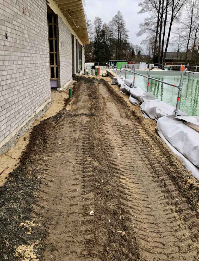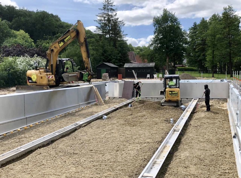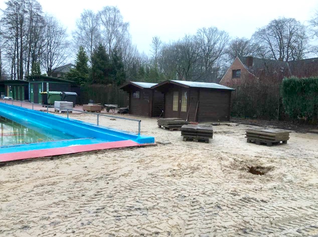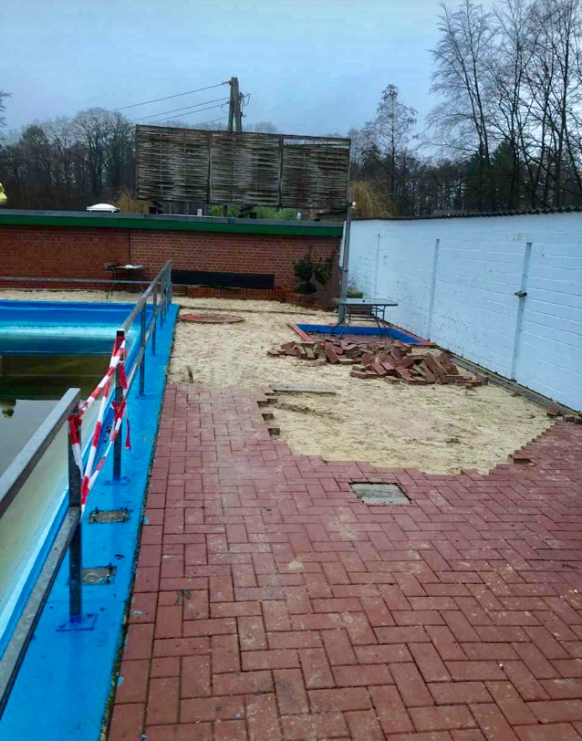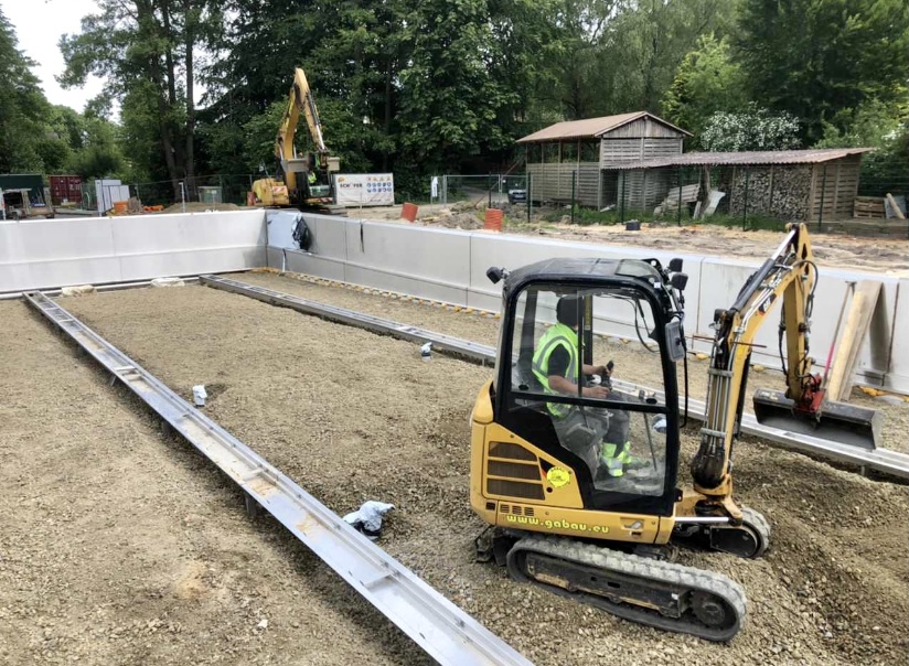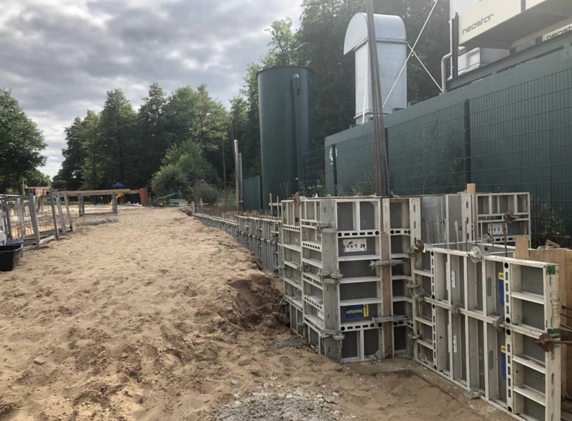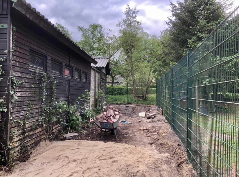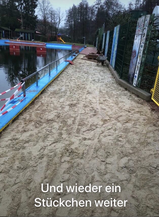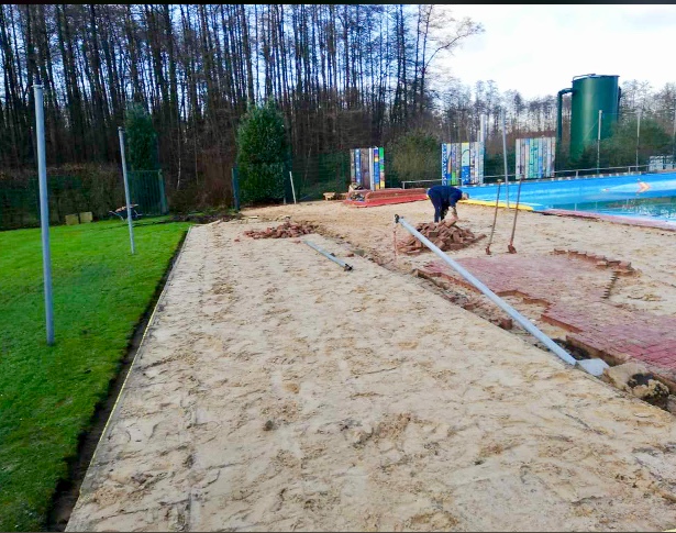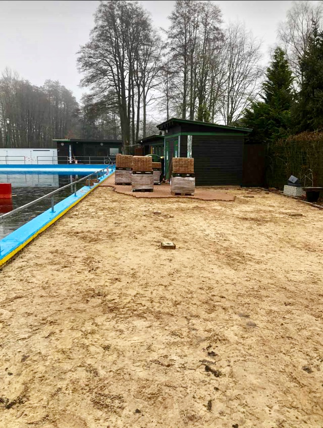 Es geht voran, die ersten Pflasterarbeiten wurden von Mitgliedern des Fördervereins geleistet. Der Aufbau nimmt auch langsam Formen an:
